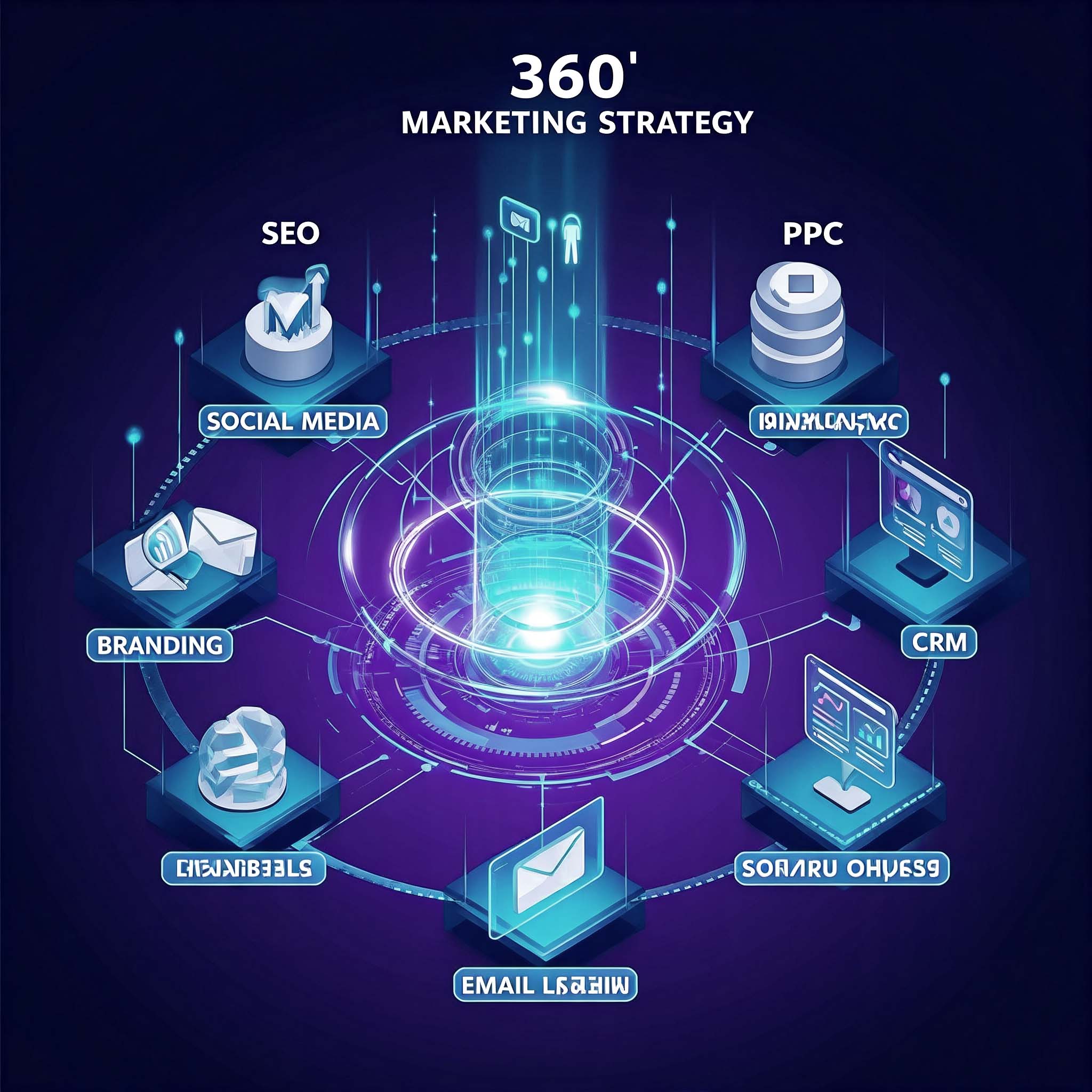 مارکتینگ ۳۶۰ درجه به معنای مدیریت همزمان و هماهنگ همهٔ نقاط تماس مشتری با برند است: تبلیغات، محتوا، روابطعمومی، تجربهٔ کاربری، خدمات پس از فروش، فروش مستقیم، کانالهای دیجیتال و آفلاین. هدف اصلی، ایجاد یک سفر مشتری یکپارچه (Seamless Customer Journey) و حداکثرسازی تاثیر هر تعامل بر اهداف تجاری است.